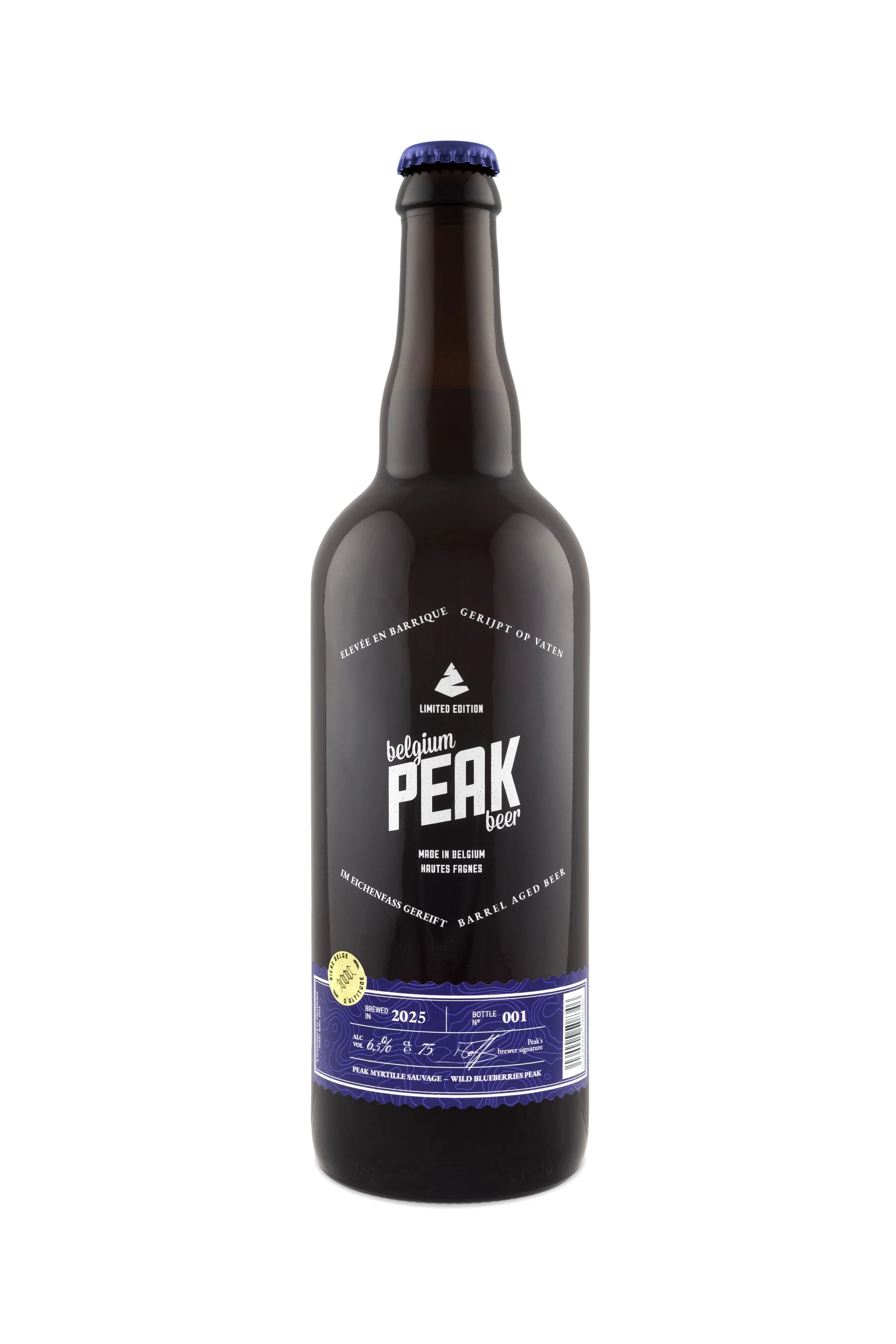 Peak Barrel Aged - Myrtille Sauvage (6,5%) : Nach über 9 Monaten in Eichenfässern und dank einer Auswahl an wilden Brettanomyces-Hefen kehrt unser Peak Myrtille mit großer Komplexität und einer für Geuze und Lambic typischen Säure zurück.
